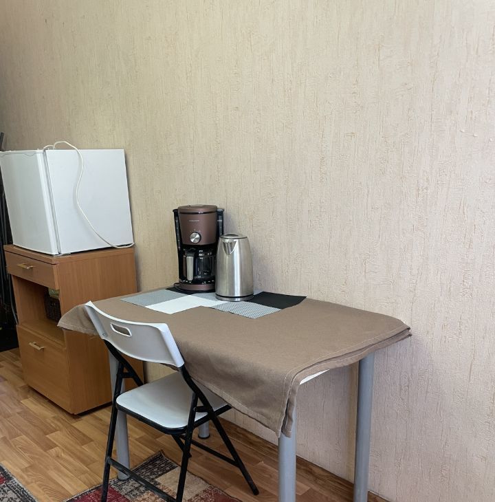 Бытовая техника в комнате: холодильник, чайник, кофеварка. Стиральная машина в ванной. Посуда предоставляется по запросу.