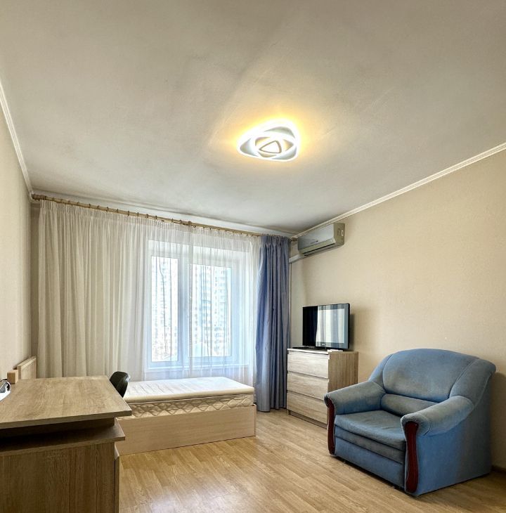 Оснащение: комната меблирована всей необходимой мебелью: кровать, стол, комод, шкаф. Из техники: холодильник, стиральная машина, телевизор, кондиционер.