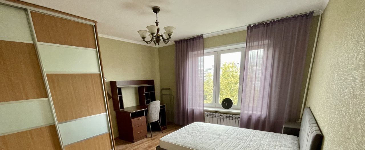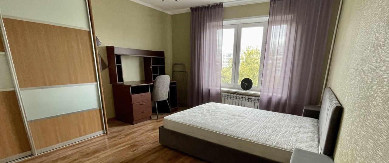 В комнате есть двуспальная большая кровать, огромный зеркальный шкаф, рабочий стол со стулом.