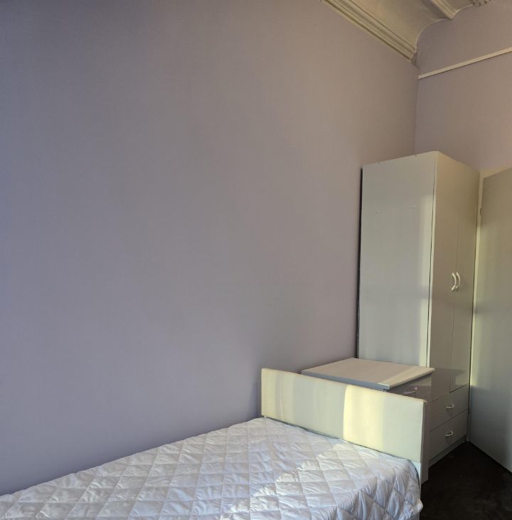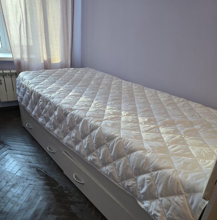 Комната после ремонта, в удобном расположении, в центре Москвы. Односпальная кровать с ящиками для белья, диван двухместный, письменный стол, обеденный стол. Платяной двустворчатый шкаф с дополнительными ящиками для белья.