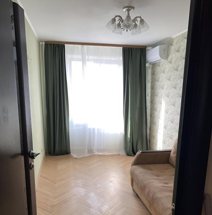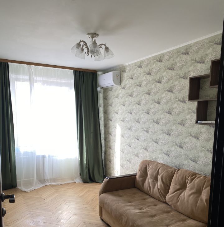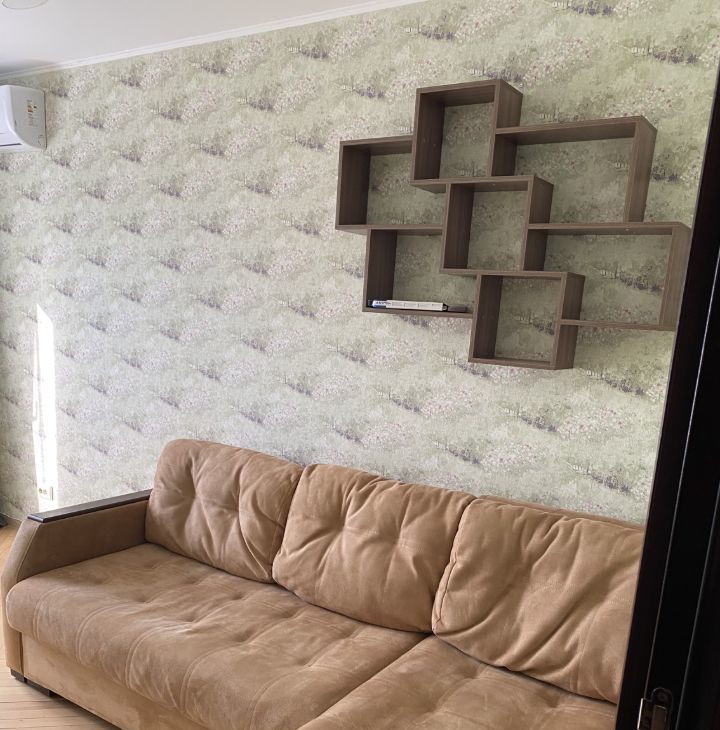 11.5 кв.м, диван, полка, новы кондиционер. Возможность докупить в комнату шкаф или комод. Стоимость аренды 35.000₽.