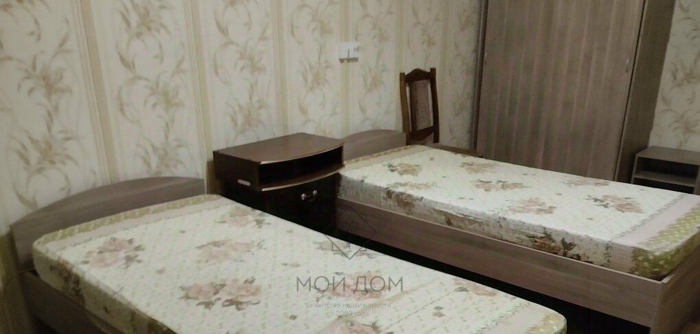 В комнате две кровати, индивидуальный холодильник, платяной шкаф, застекленная лоджия.