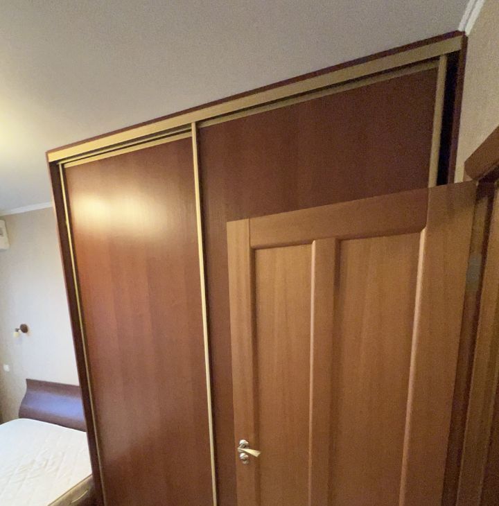 в комнате вместительный шкаф, кондиционер, туалетный столик с зеркалом, на кровати ортопедический матрац,