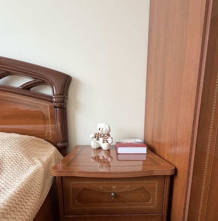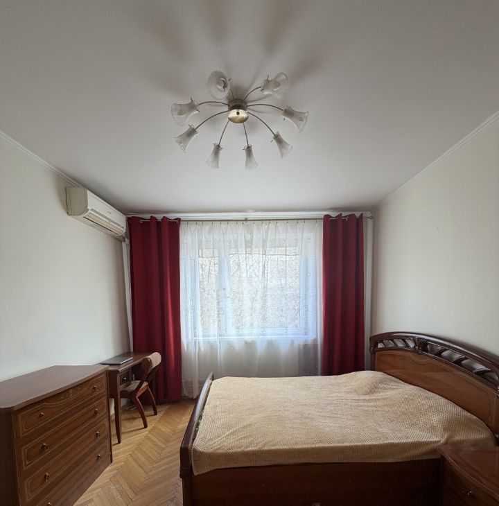 Сдается меблированная комната на длительный срок. Из мебели: двуспальная кровать, шкаф, комод, прикроватная тумбочка, стол, стул, кондиционер.