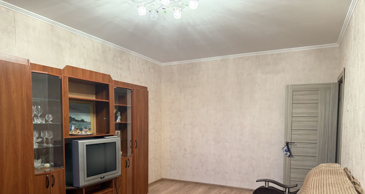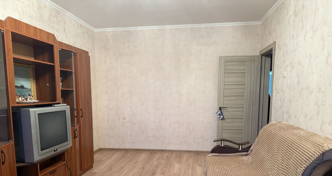 В комнате необходимая мебель: новый двуспальный диван, шкаф, рабочий стол, ТВ.