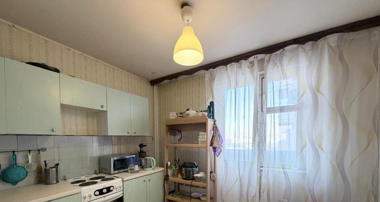 В квартире просторная кухня 10 м2, холодильник, стиральная машина-автомат. Есть кухонный гарнитур, плита и духовка.