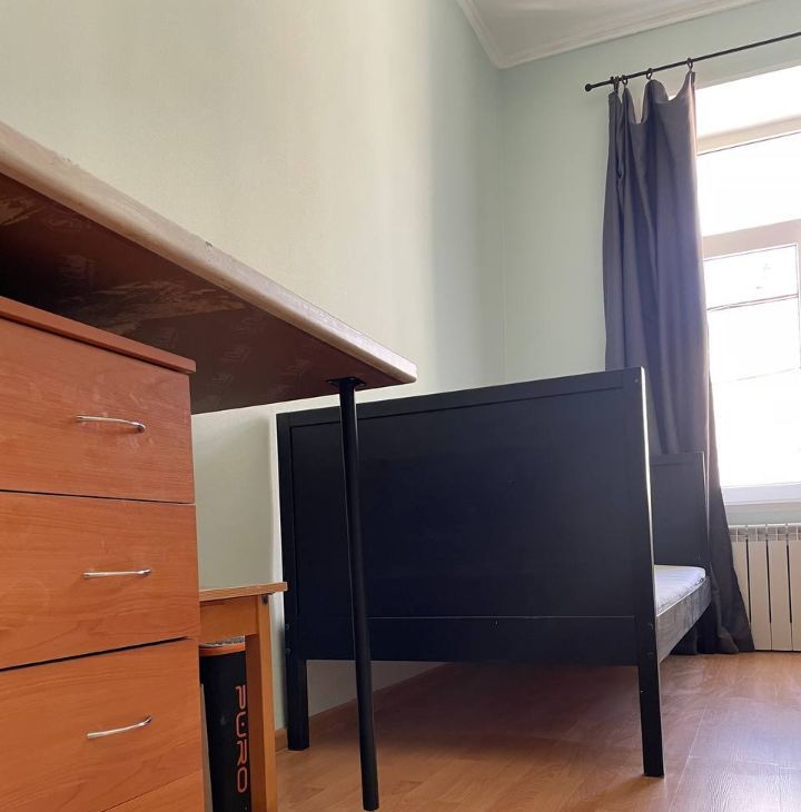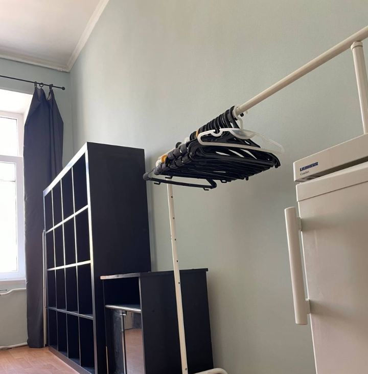 В комнате есть все необходимое: кровать, комод для хранения вещей, рабочая зона, холодильник, стиральная машина, вешалки, полки, стол, ит.д.