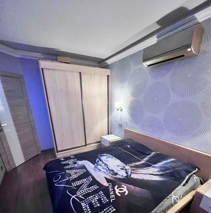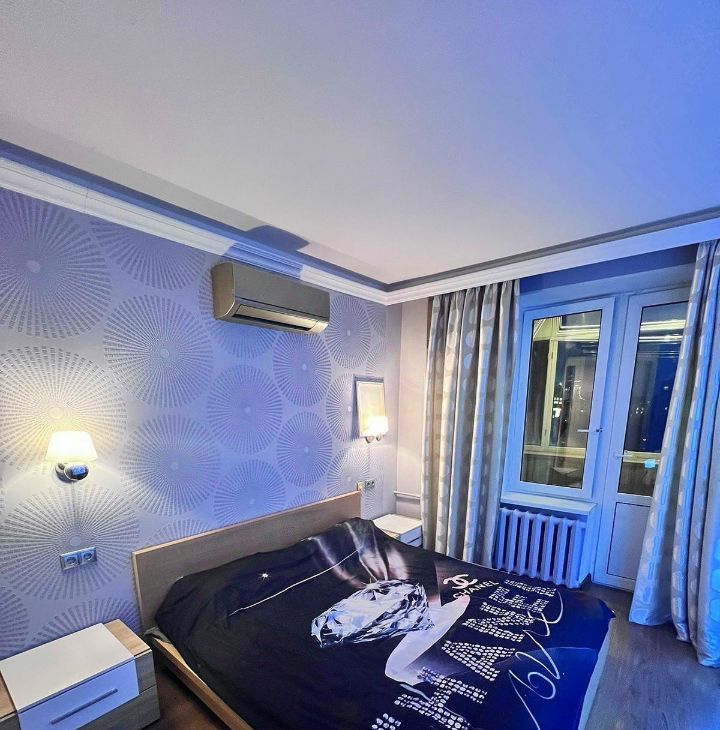 В комнате двухспальная кровать, шкаф купе,тумбочки,кондиционер, выход на балкон