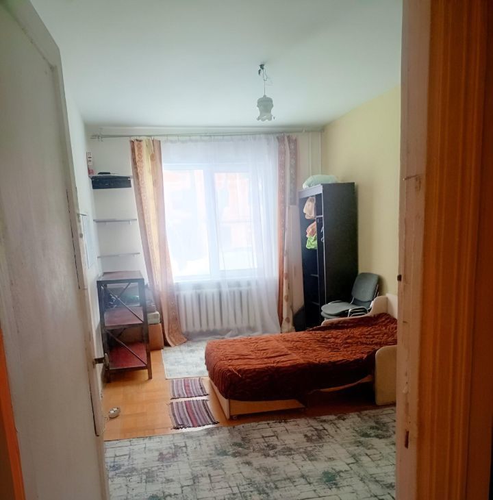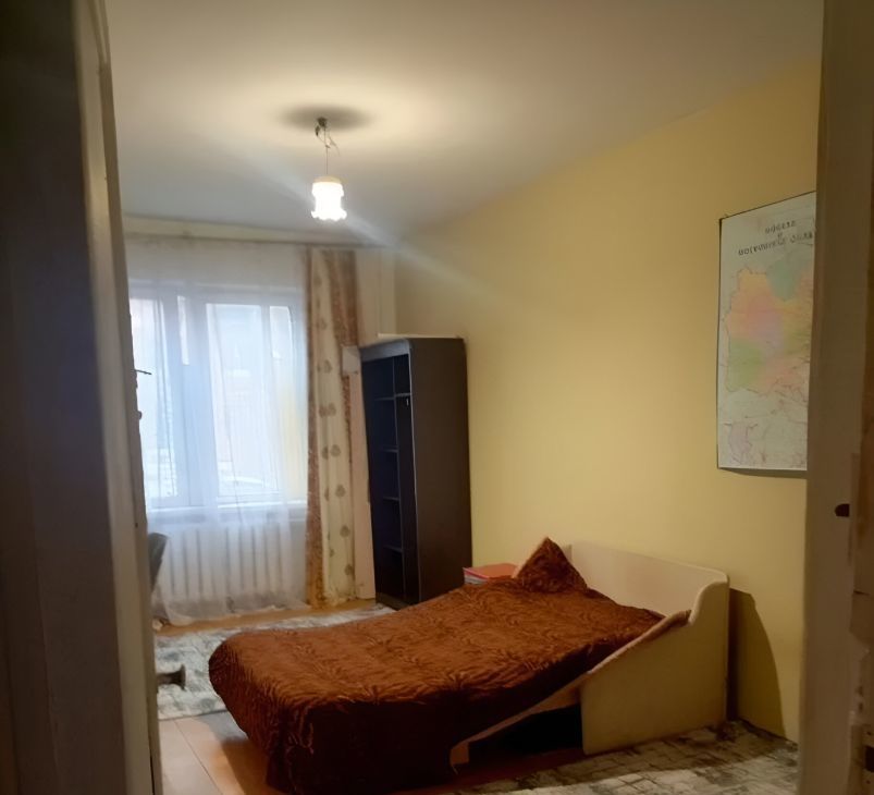 Комната просторная не захламленная, есть диван ш120/195, шкаф для вещей, компьютерный стол, в комнате стеклопакет. Ремонт средний, без изяществ. В квартире курят на кухне.