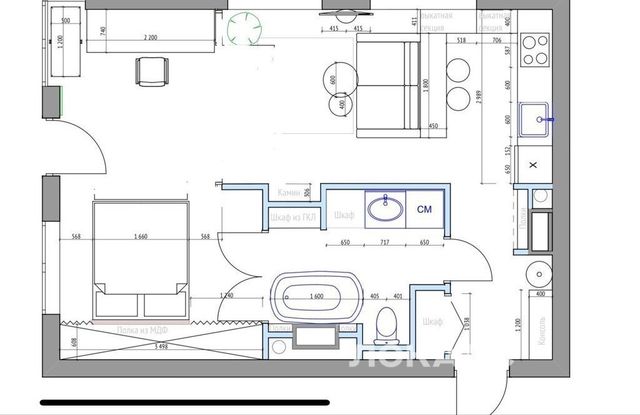 * студийная планировка с зонированием спальни и гостиной, рабочей зоны;