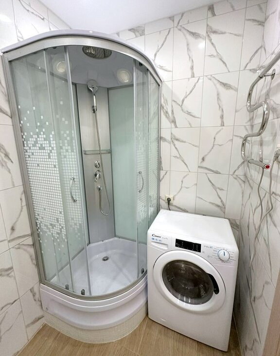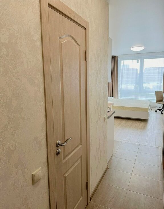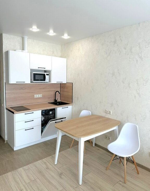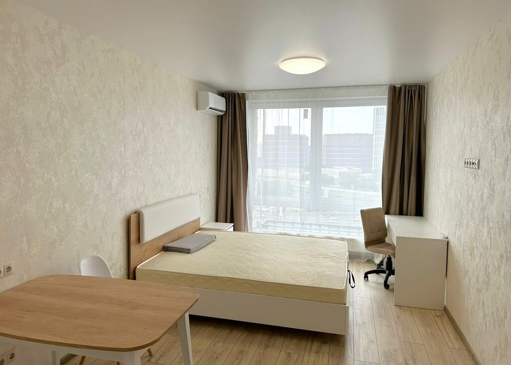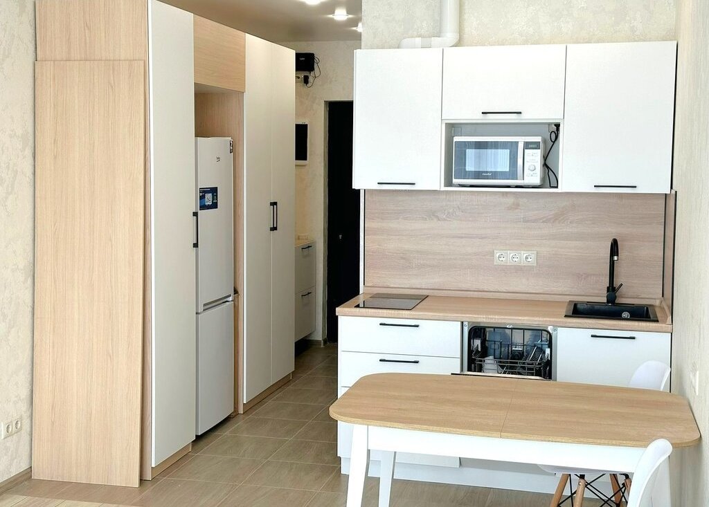 Студия полностью обустроена для комфортного проживания. Стоит двуспальная кровать с удобным матрасом, есть рабочая зона. На кухонной зоне: современный кухонный гарнитур под единой столешницей, электрическая варочная панель, полноценный двухкамерный холодильник, микроволновая печь и посудомоечная машина. Есть зона хранения в прихожей. Санузел совмещен, в плитке до потолка, стоит стиральная машина.