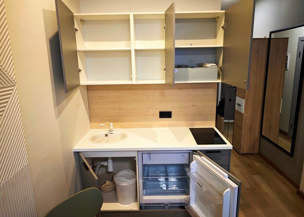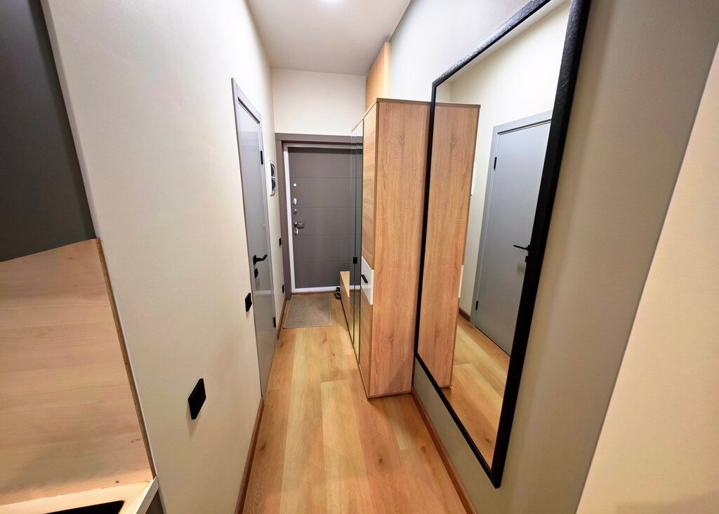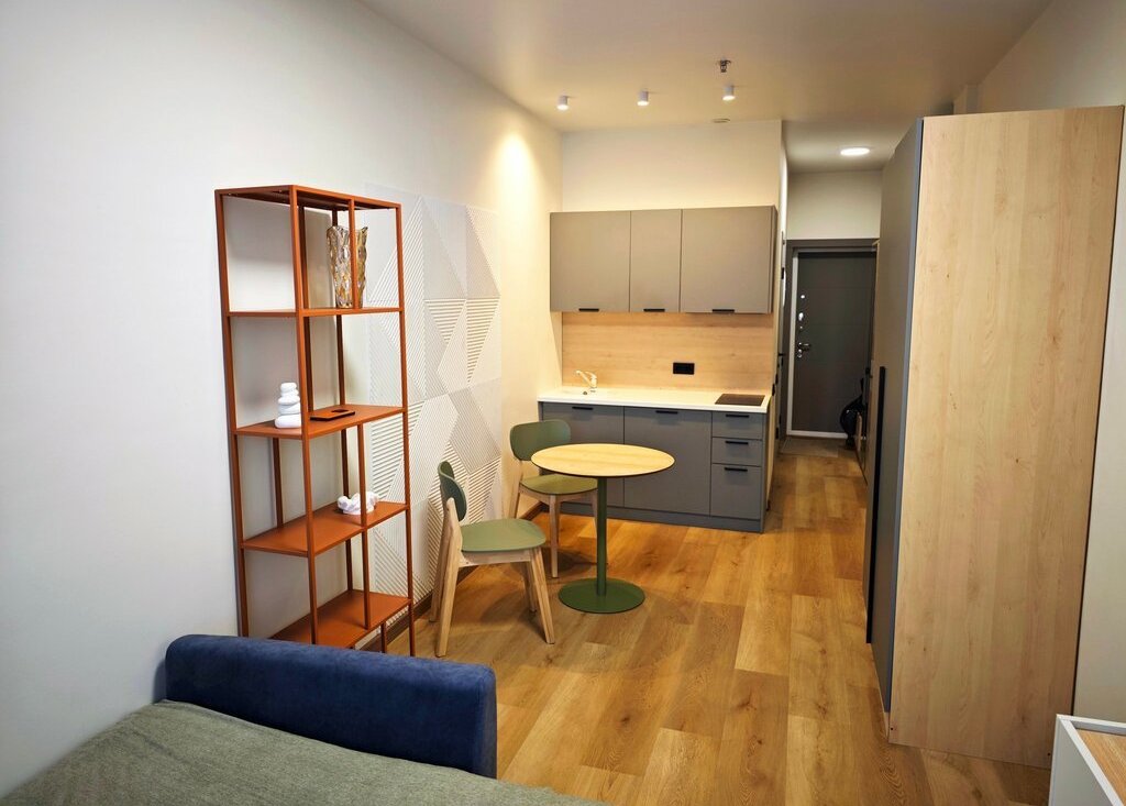 Общая площадь — 26,5 кв. м, жилая — 22 кв. м. Студия находится на 2 этаже 2-этажного дома.
