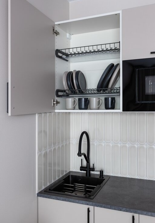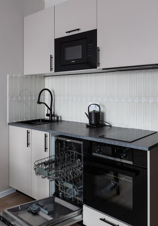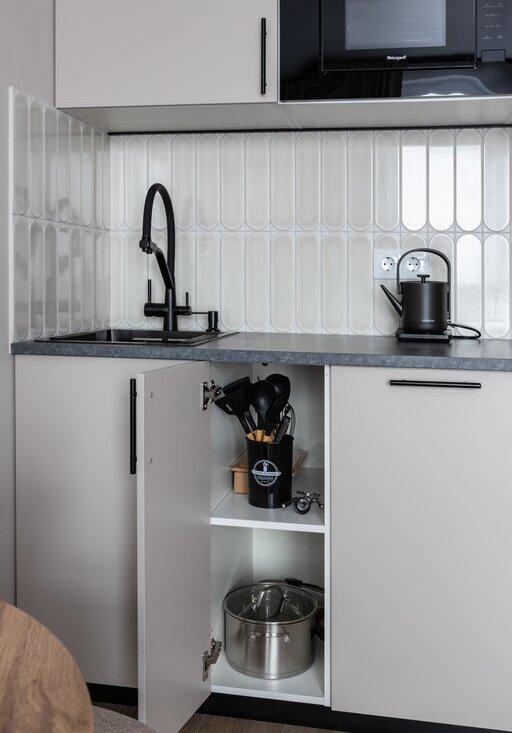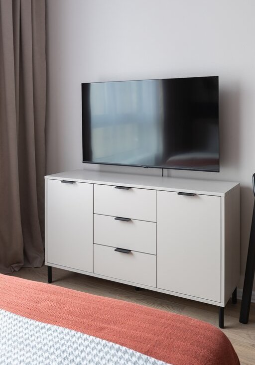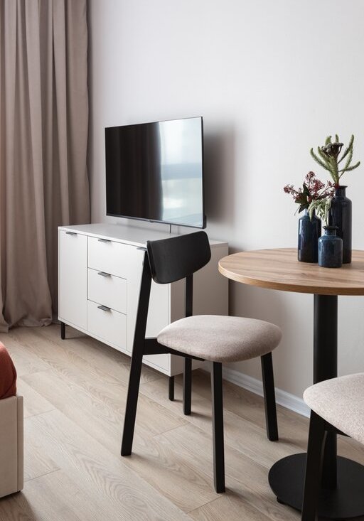В квартире сделан дизайнерский ремонт, что придаёт ей особый уют и комфорт. Пространство студии максимально функционально: здесь есть всё необходимое для комфортной жизни. В комнате и на кухне установлена современная мебель, а из техники — кондиционер, холодильник, телевизор, посудомоечная и стиральная машины. В совмещённом санузле установлена душевая кабина.