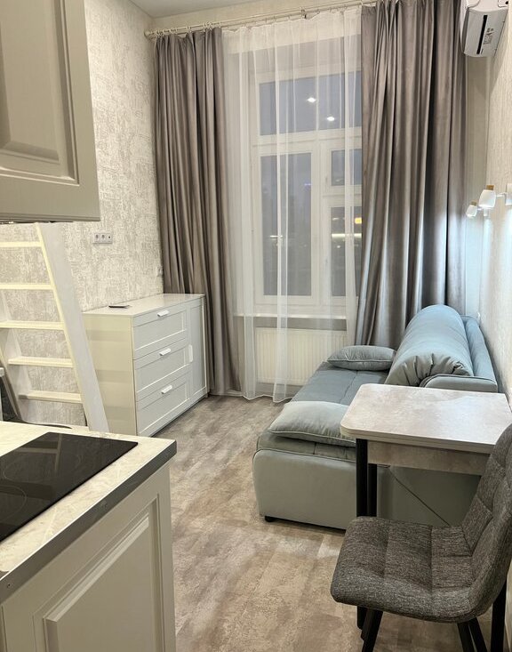Сдаётся в долгосрочную аренду студия 20м2 после ремонта, с высокими потолками и роскошным видом на Москва-Сити в историческом здании в 2-3х минутах пешком от метро Беговая и 1й минуте от МЦД-1 Беговая.