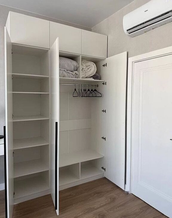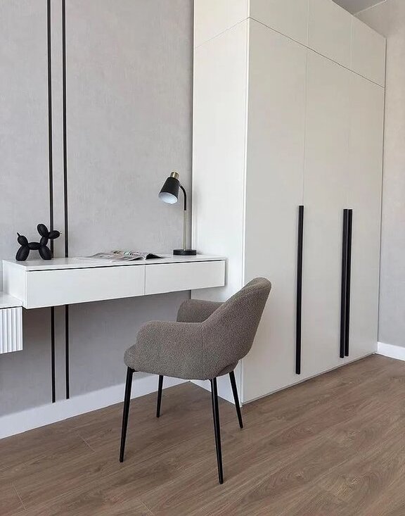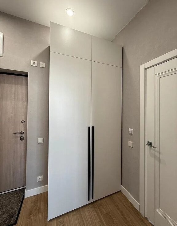 Достаточно мест для хранения: два вместительных шкафа (в комнате и в прихожей). Напротив входной двери зеркало в полный рост, подвесная тумба и трендовый пуф букле на ножках.
