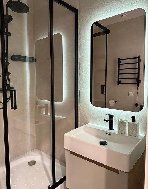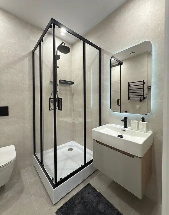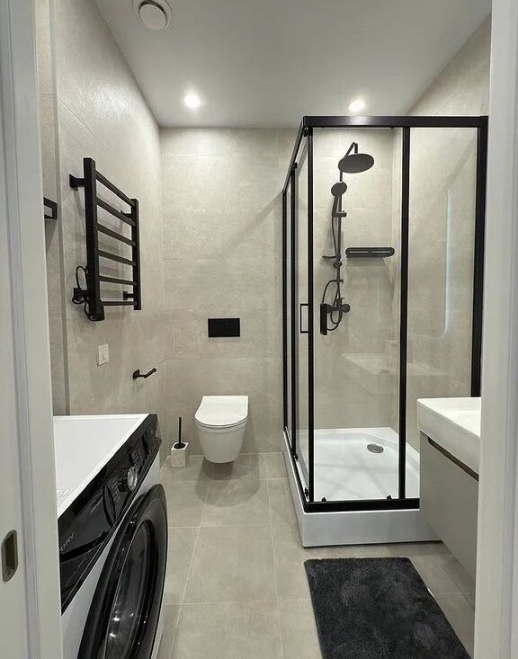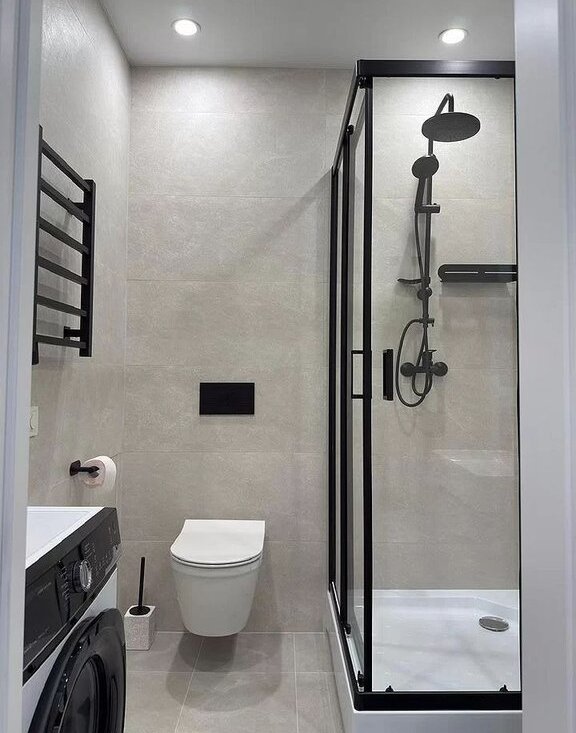 Совмещенный санузел: эргономичная душевая кабина, инсталляция, стиральная машина, теплый пол.