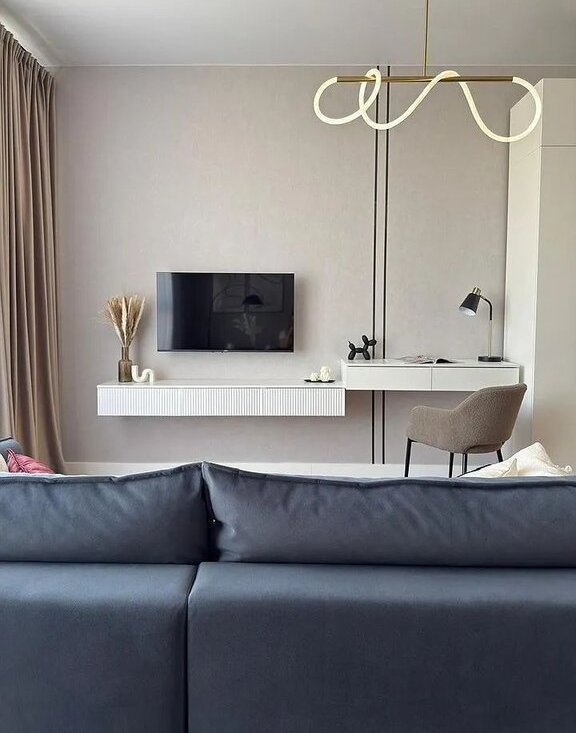 Обеденная зона возле окна, большой уютный и функциональный диван с углубленной посадкой и независимым пружинным блоком, телевизор, обособленная рабочая зона с дополнительным светом.
