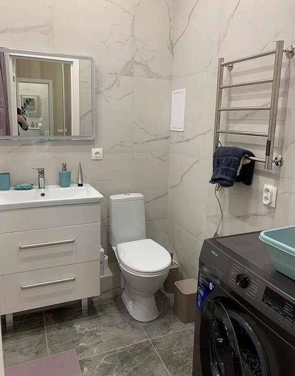 Санузел с ванной, унитазом, зеркалом с подсветкой, полотенцесушителем и стиральной машиной.
