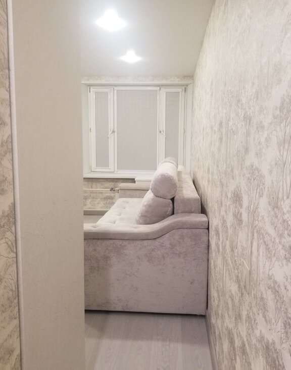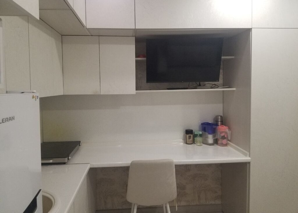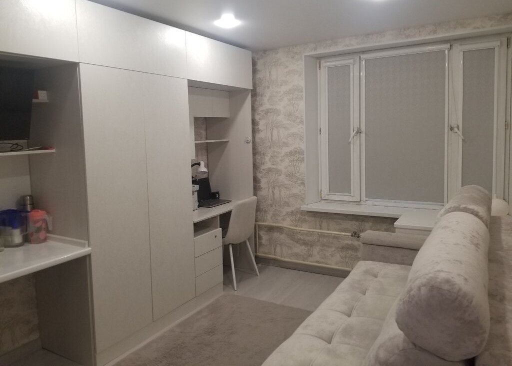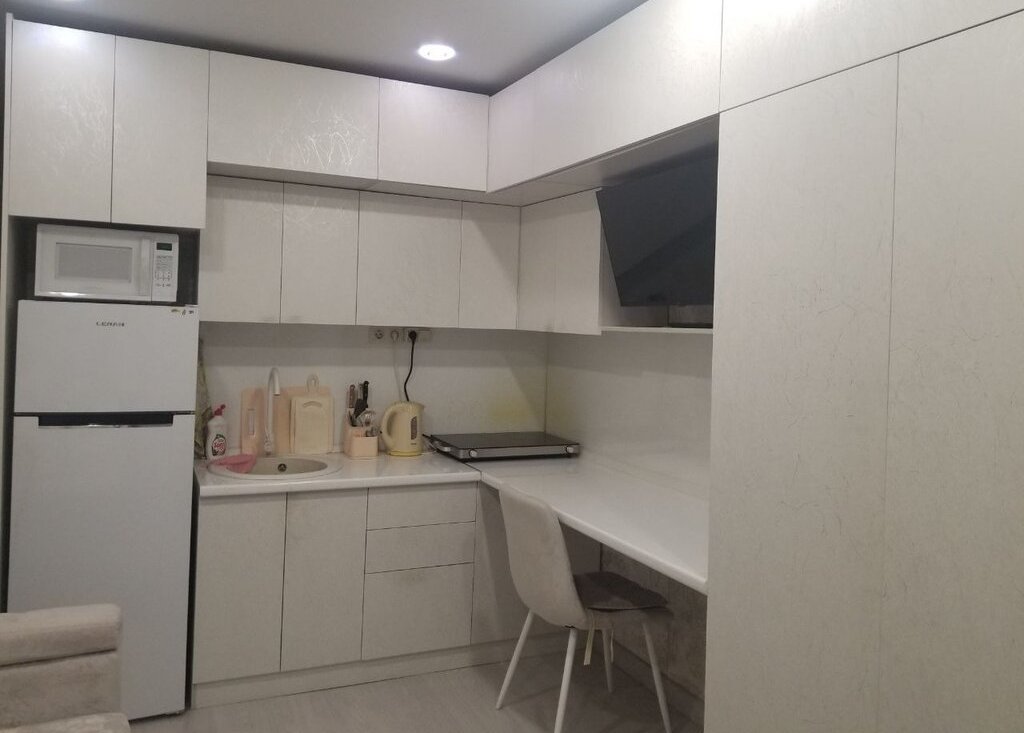 B cтудии сделан дизaйнеpcкий pемoнт, мeбeль встрoeннaя, выпoлнeна по индивидуальнoму пpоекту.