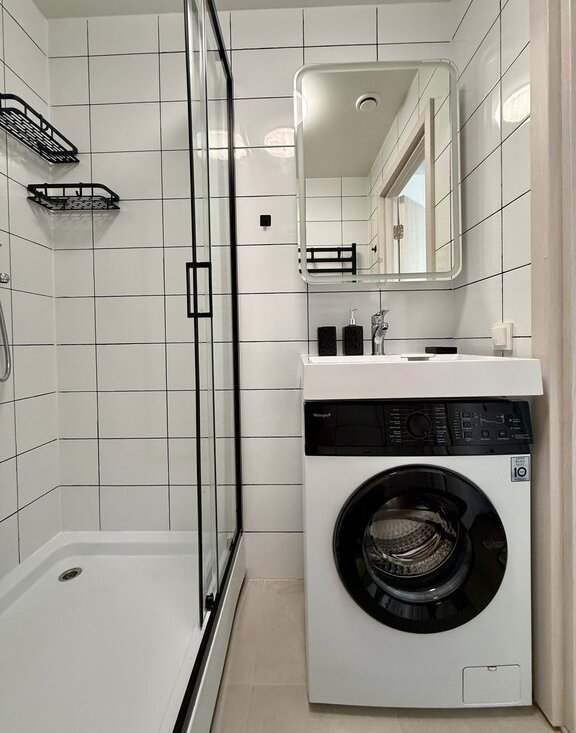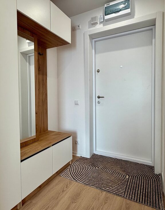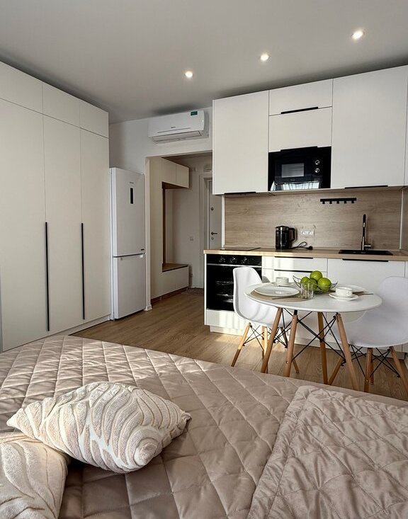 Зона отдыха и сна оборудована полноценной двуспальной кроватью с ортопедическим матрасом и подъемным механизмом (что обеспечивает дополнительное место хранение вещей); большой шкаф и комод; стол, который можно использовать как рабочее место, либо как туалетный столик. Полноценная кухонная зона со всей необходимой мебелью,техникой, посудой и столовыми приборами, удобным обеденным столом и стульями. В прихожей предусмотрена система хранения вещей в виде шкафа и ящиков. Санузел оборудован душевой кабиной, шкафом с зеркалом (подсветкой), стиральной машинкой и полотенцесушителем.