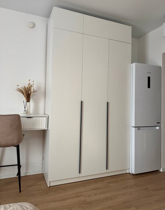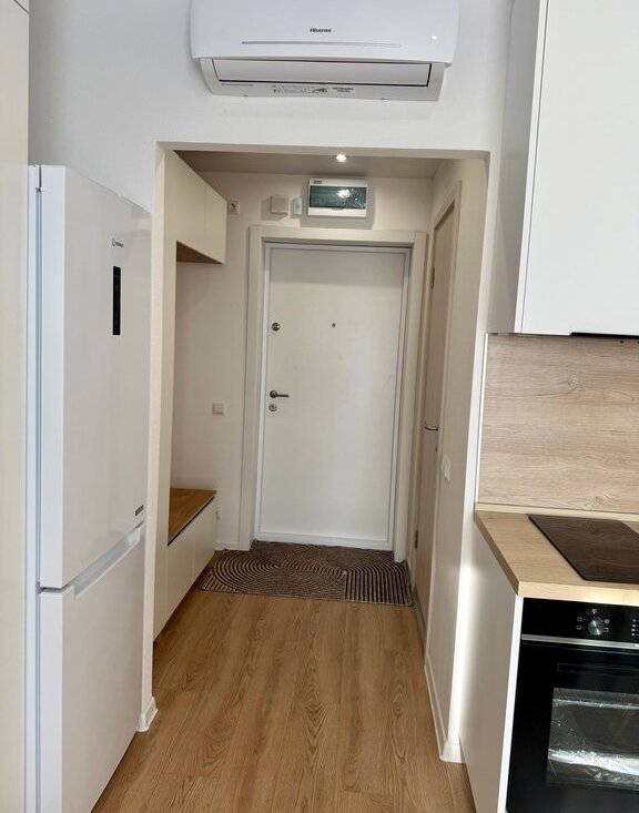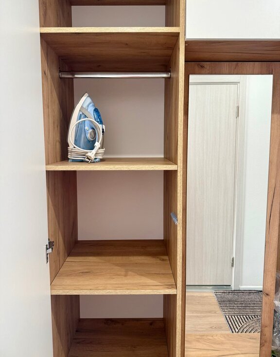 Бытовая техника: кондиционер, стиральная машинка, духовой шкаф, варочная панель, вытяжка, встроенная микроволновая печь, электрический чайник, холодильник, телевизор, утюг.