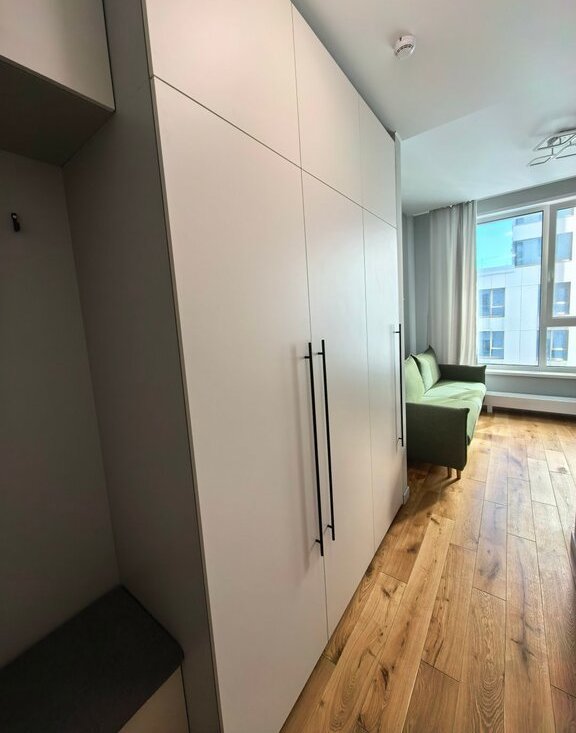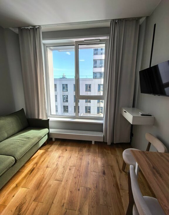 Интерьер выполнен в светлых спокойных тонах, что визуально расширяет пространство. Большое окно обеспечивает много естественного света. Квартира расположена на 11 этаже, окна выходят во двор — тихо, без шума дорог.