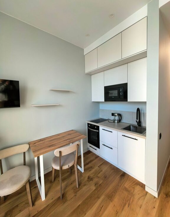 — кухонную зону с полноценной встроенной техникой (варочная панель, духовой шкаф, микроволновка)