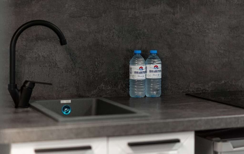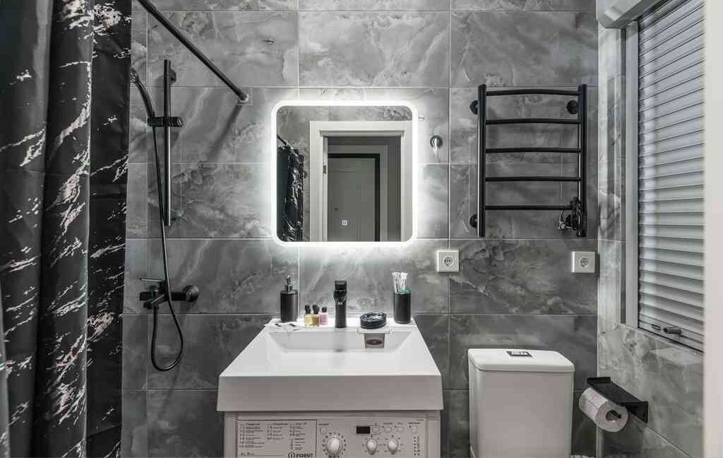 Кухонная зона полностью оборудована для ежедневного приготовления пищи: варочная панель, микроволновая печь, холодильник, чайник и необходимый набор посуды. Санузел с душевой кабиной оснащён стиральной машиной — важный плюс для комфортного проживания на длительный срок.