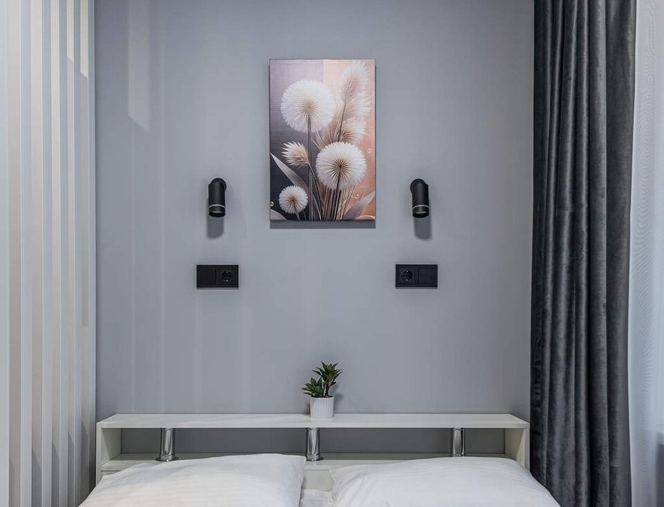 Пространство оформлено в мягких светло-серых и нежно-розовых тонах, создающих атмосферу уюта и домашнего тепла. В комнате — удобная двуспальная кровать с качественным матрасом, телевизор и продуманная система хранения. Компактная планировка позволяет эффективно использовать каждый метр без ощущения тесноты.