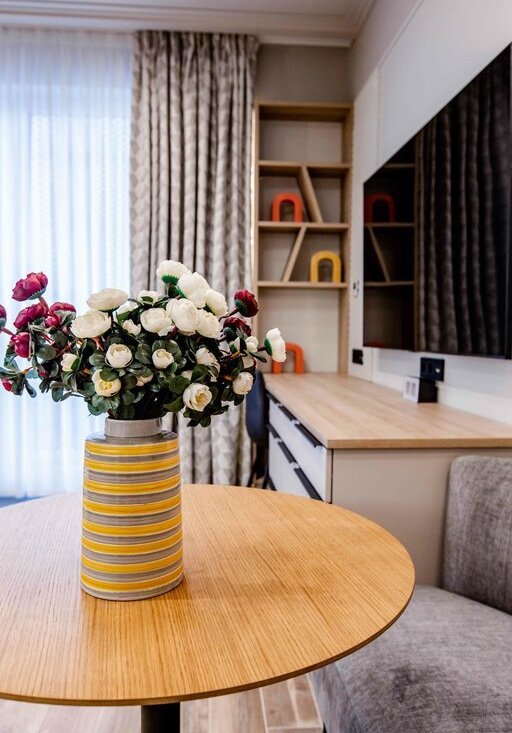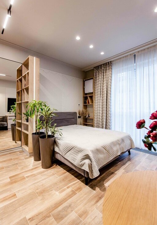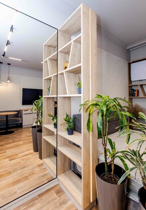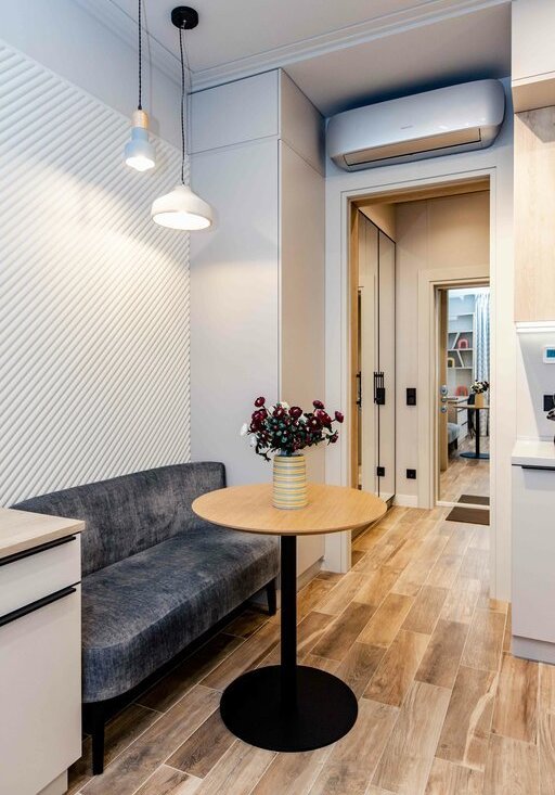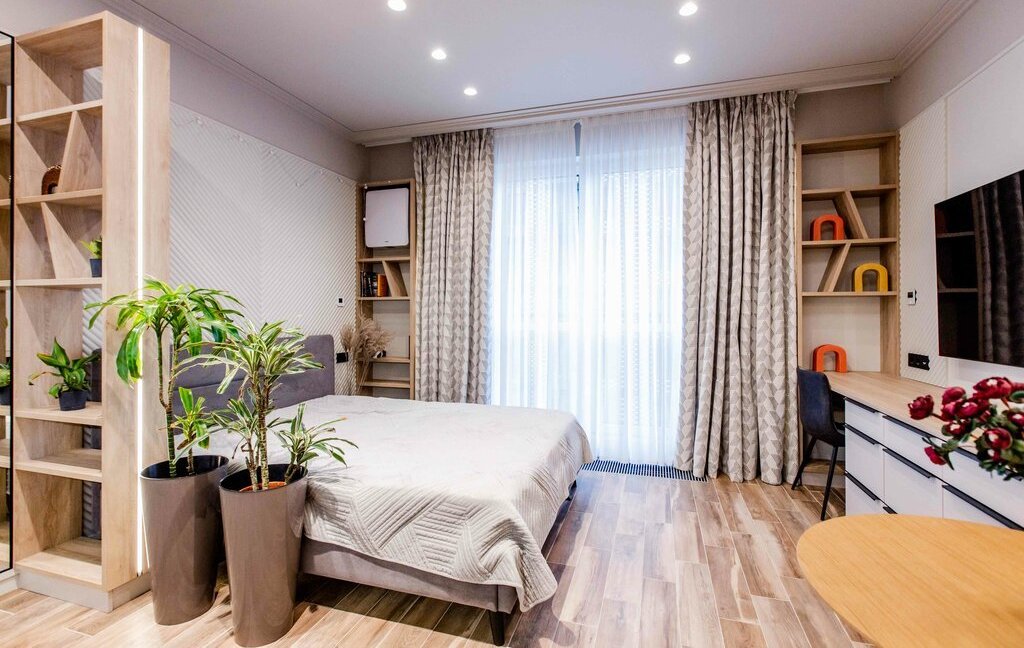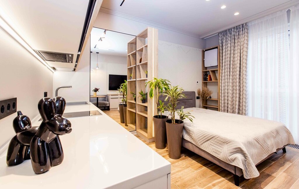 В квартире спроектирована удобная рабочая зона, много мест хранения, полноценная кровать с ортопедическим матрасом, полноценная зона приготовления пищи.