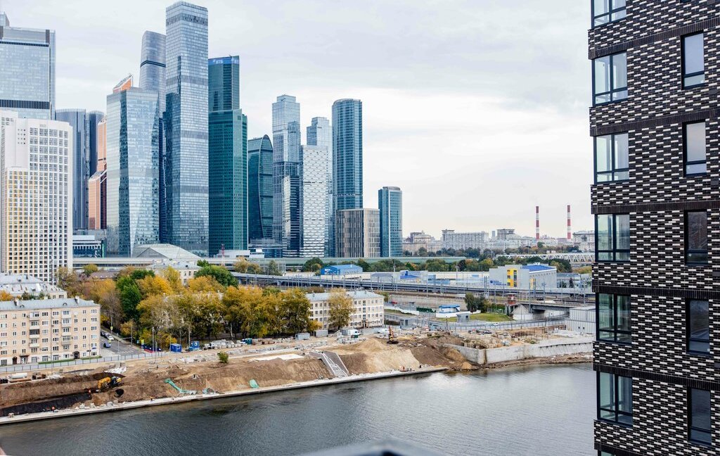 Квартира находится на высоком этаже, из панорамного окна и балкона открывается вид на реку и башни Сити.
