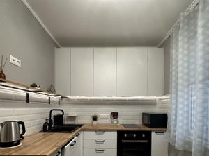· Мебель: кухонный гарнитур, стол и стулья, комод из массива дерева, 2 стеллажа, встроенный шкаф-купе с зеркальными дверцами, кровать двуспальная с выдвижными ящиками и матрасом