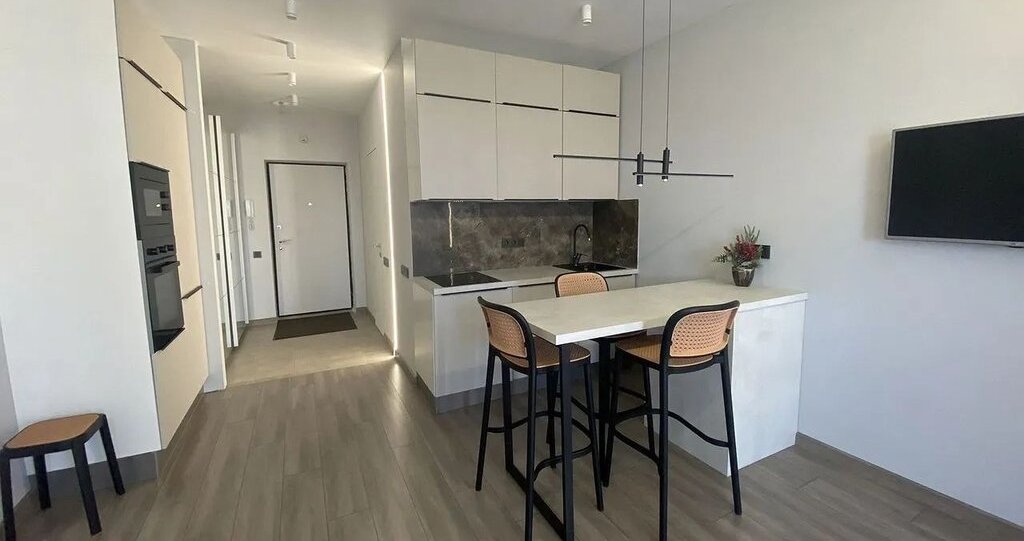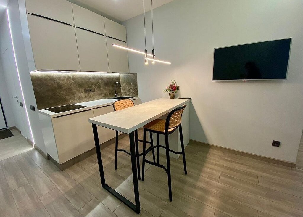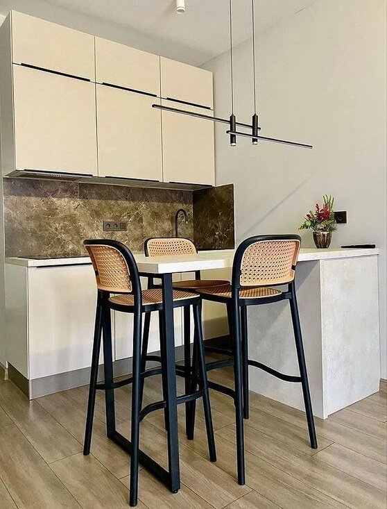 - Современный кухонный гарнитур с барной стойкой и стульями и всей необходимой техникой: