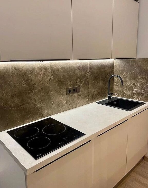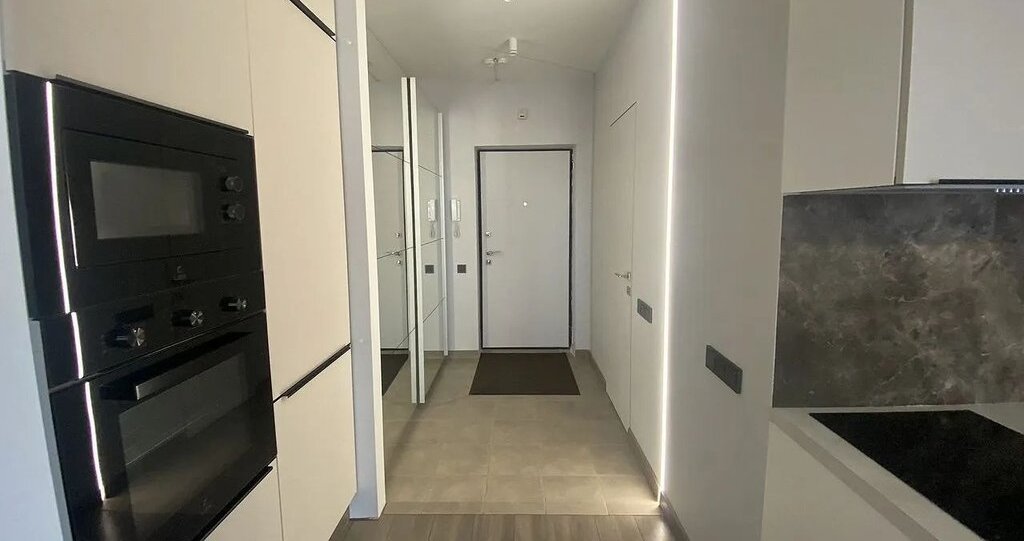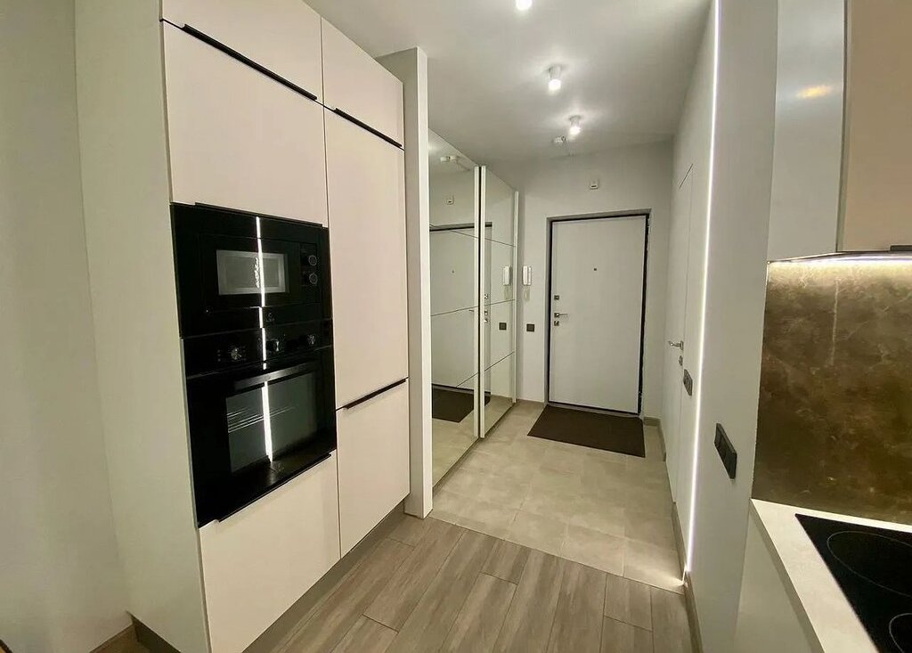 - Встроенный холодильник, духовка, микроволновка, вытяжка, большая плита и посудомойка