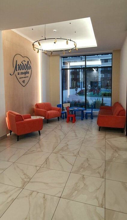 В подъезде есть зона ожидания с диваном и гостевой санузел, удобный вход в подъезд с уровня земли без излишних ступенек.