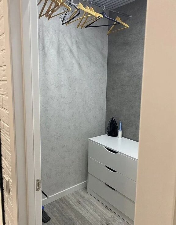 Планировка включает: большую комнату-гостиную, изолированную гардеробную, совмещенный с/узел.