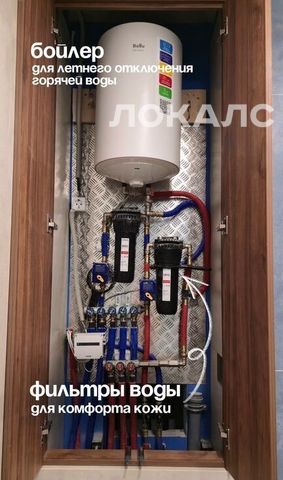 Санузел 4,1 м²: ванна с душем, инсталляция, полотенцесушитель, зеркало с подсветкой. Инженерия: бойлер для летних отключений ГВС, магистральные фильтры воды для комфортной жёсткости.