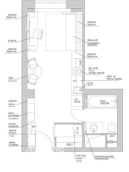 Спальное место 160×200 с ортопедическим матрасом, диван-кровать Askona, рабочее место с большим столом (190×60), ТВ-зона, кладовая/гардеробная со стиральной машиной.