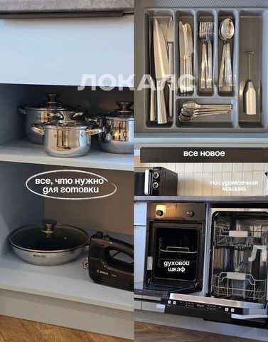 Кухня с высоким гарнитуром, двухъярусными шкафами до потолка, встроенным холодильником, посудомойкой, духовкой, варочной панелью, микроволновкой. Есть кофемашина, кофемолка, фильтр питьевой воды. Полный комплект новой посуды.