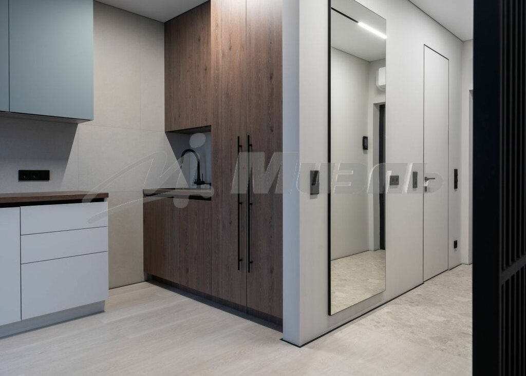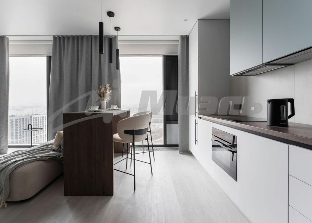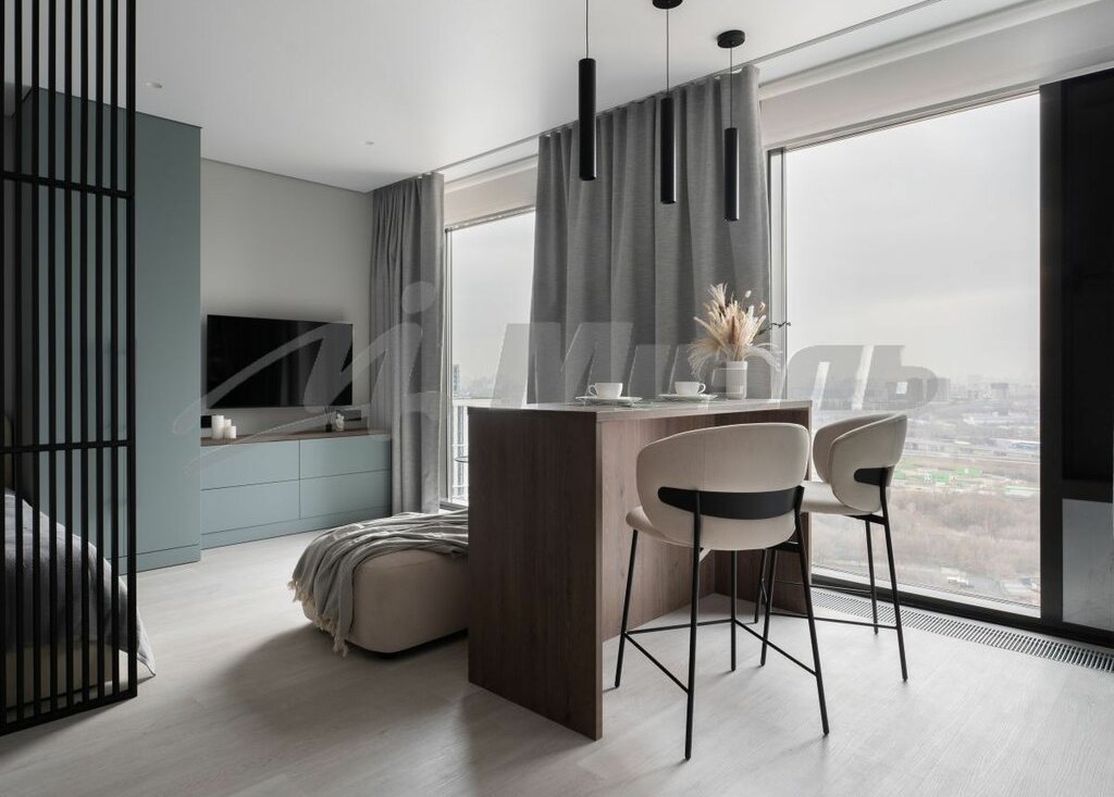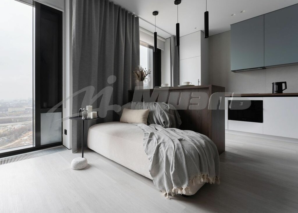 - прекрасно продуманная функциональная планировка: комната-студия с выделенной спальной и кухонной зоной, гардеробная, совмещённый санузел, прихожая.