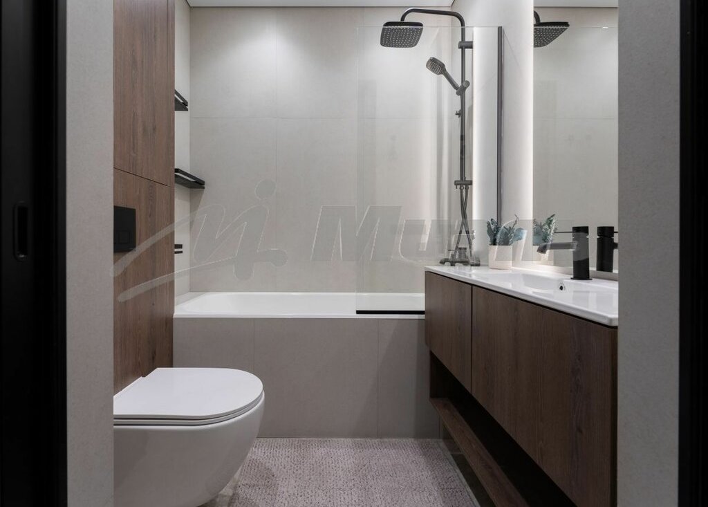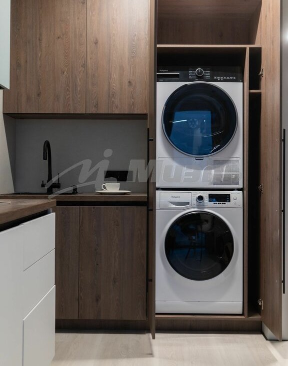 - актуальный трендовый дизайн. Квартира полностью оснащена мебелью по индивидуальному проекту и качественной бытовой техникой: бесшумный холодильник с системой NO FROST, посудомоечная машина, варочная панель, вытяжка, духовой шкаф с функцией СВЧ, стиральная и отдельно сушильная машина, телевизор с большой диагональю со SMART-TV.