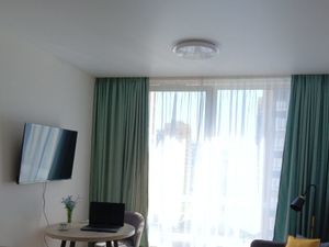 Метраж 16+6 кв.м. на двух уровнях. Есть зона кухни, компьютерный стол и кресло (ра складывается, спальные место 90*200), зона отдыха. На втором уровне большой ортопедический матрас средней жесткости, размер 160х200. В квартире очень тепло.