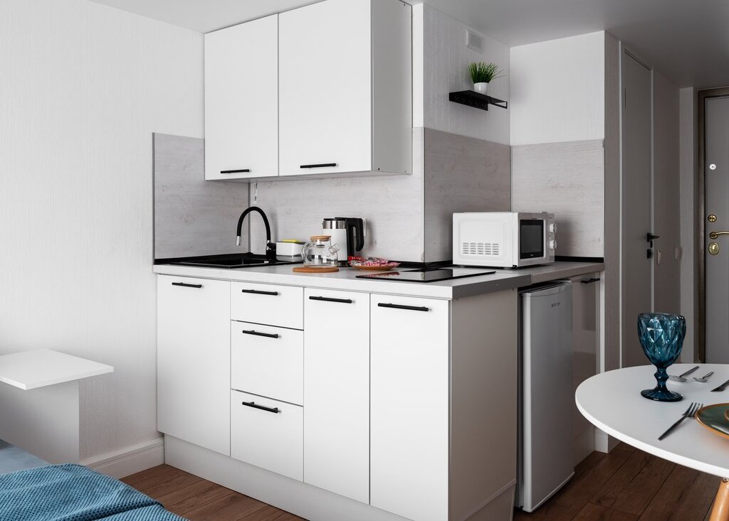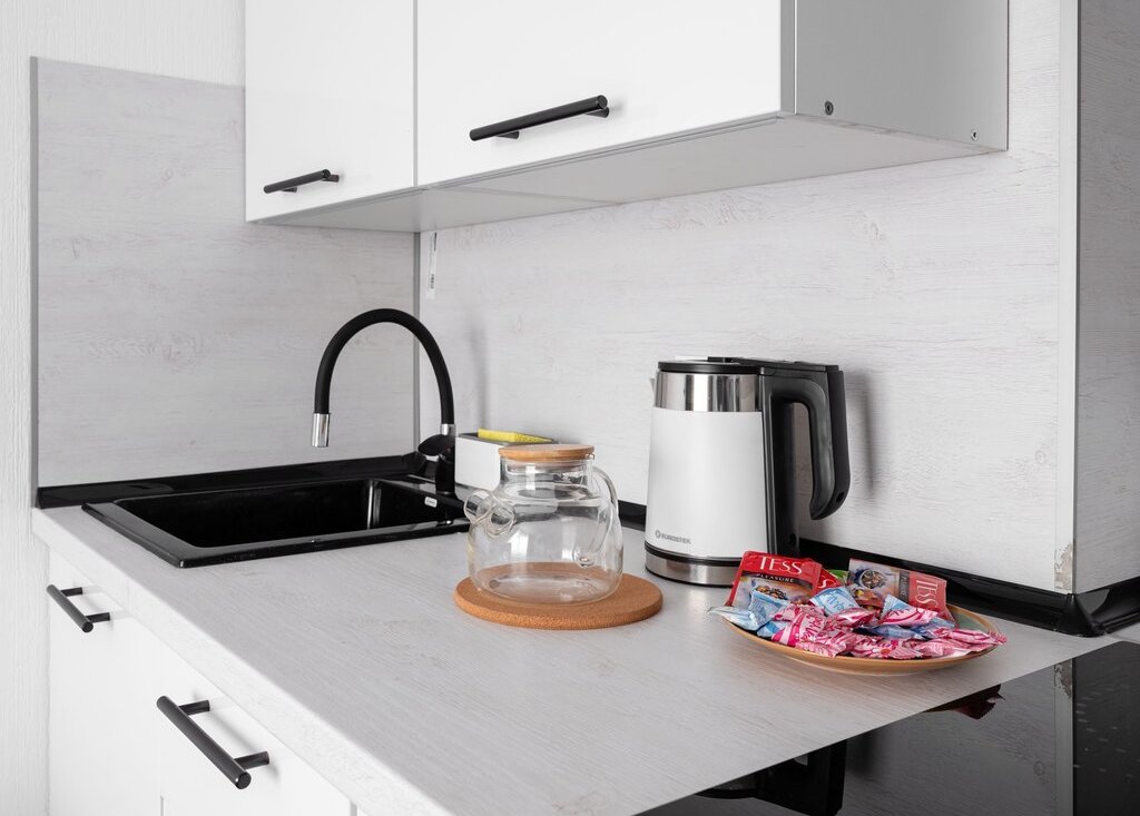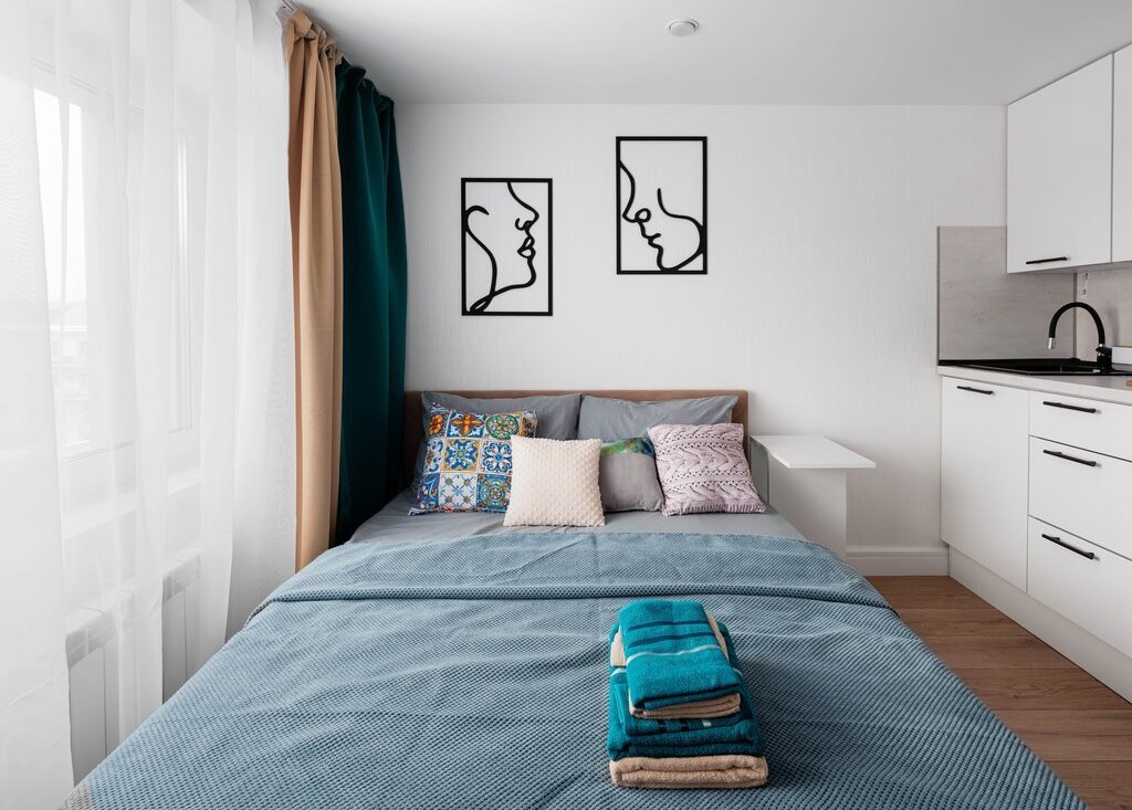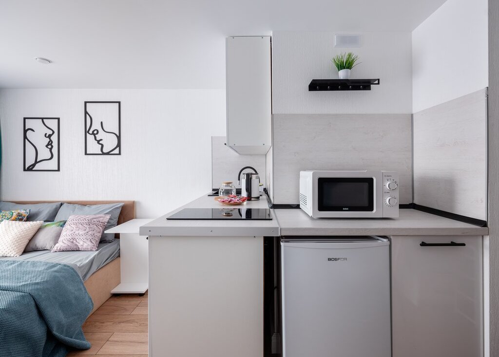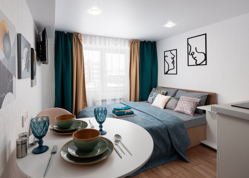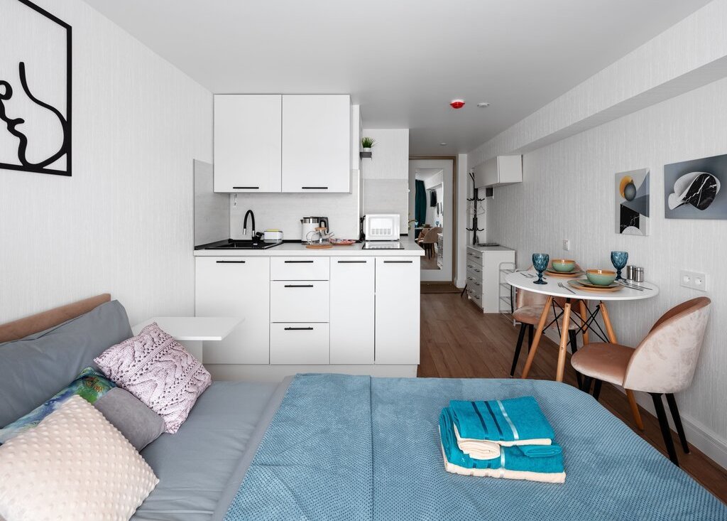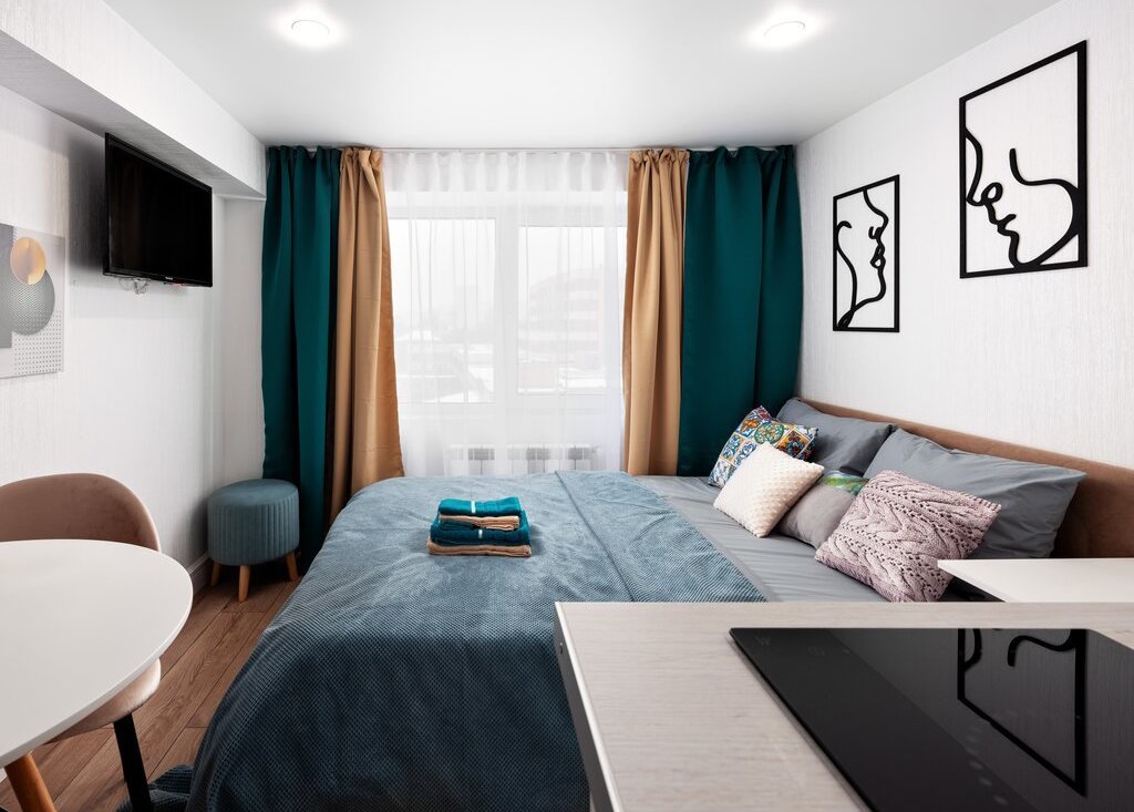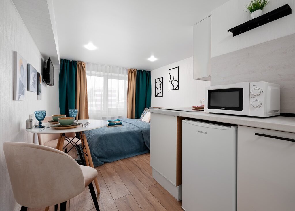 В самих апартаментах с комфортом разместиться двое гостей. Приятный светлый дизайн располагает к прекрасному отдыху. По наполнению внутри имеется абсолютно всё необходимое для проживания как короткого, так и продолжительного.