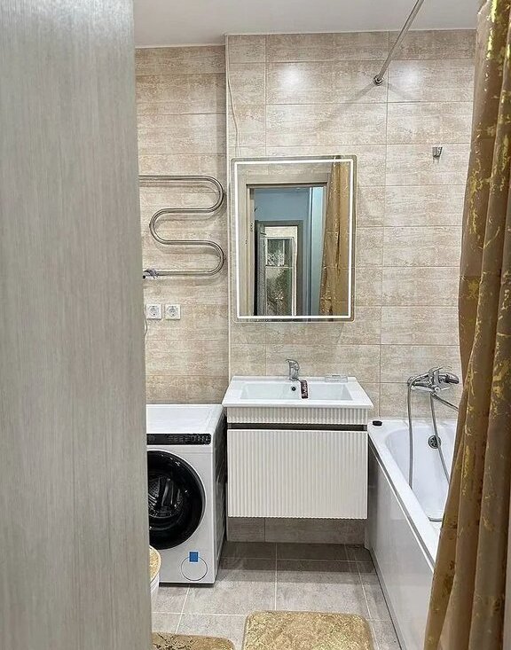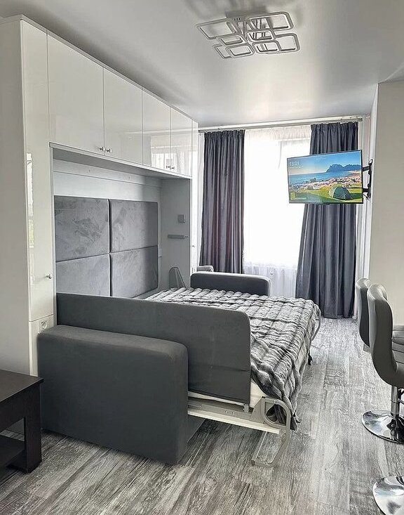 В квартире выполнен дизайнерский ремонт. Для вашего максимального комфорта есть всё необходимое: интернет, кондиционер, холодильник, телевизор, стиральная машина и прочие для проживания вещи (про принципу въезжай и живи). В кухне и комнате установлена современная мебель, а в ванной комнате — ванна. Планировка студии позволяет максимально эффективно использовать пространство, гардеробная и максимальное количество шкафов.
