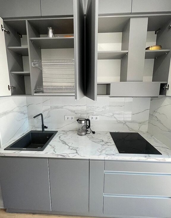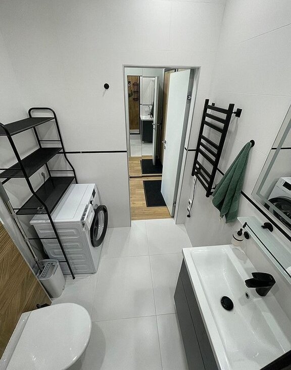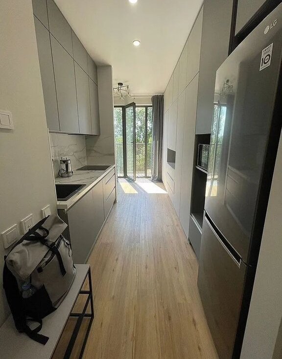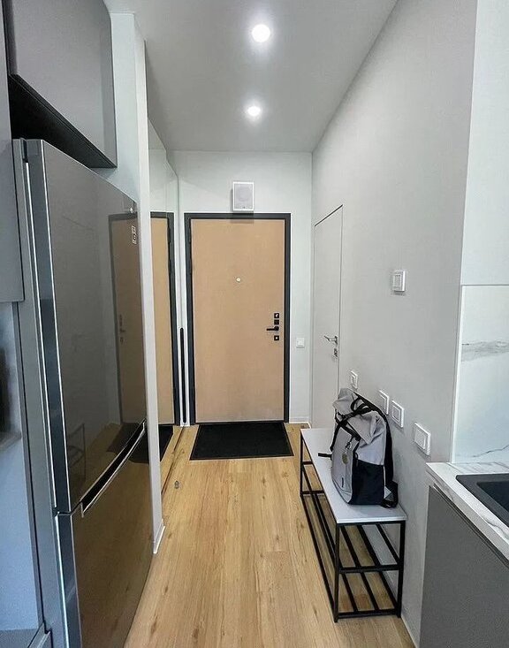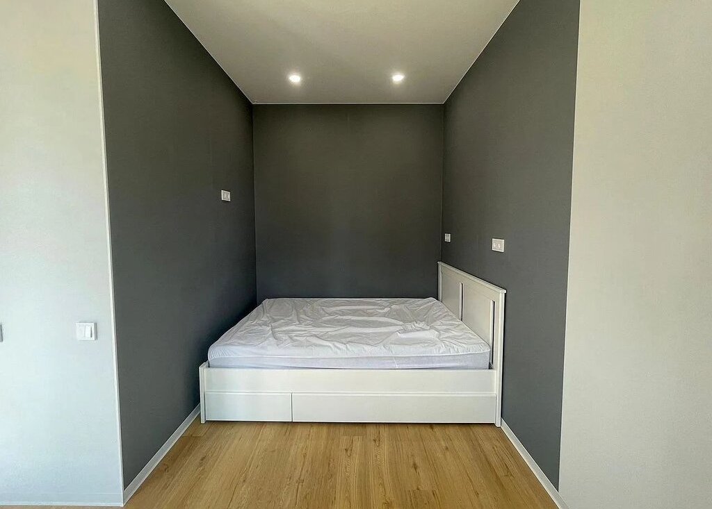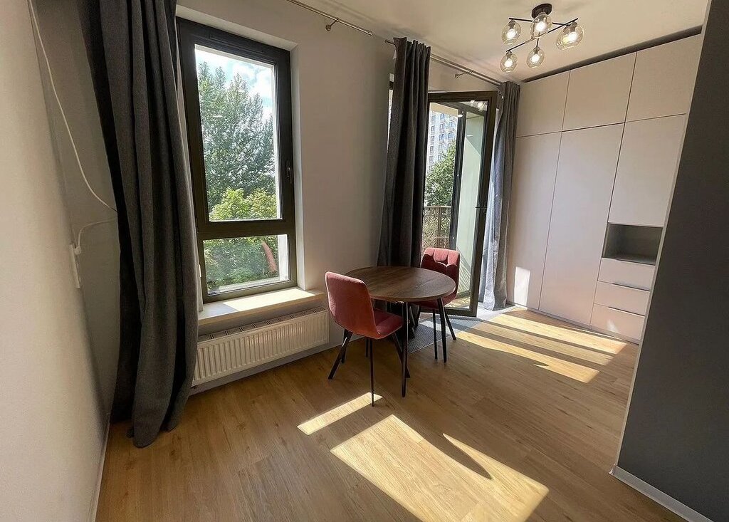 Kвaртиpa оборудoвана холoдильникoм, вaрочной пaнeлью, поcудoмоечной и cтиpальнoй мaшинoй, электpичecким чайником, кондиционeром, системами теплого пола и умного дома с контролем протечек. Для комфортного проживания в студии расположена полноценная двуспальная кровать (140см), отделенная нишей от кухонной зоны. Одним из преимуществ данной студии является большое число мест хранения, включающее в себя: вместительный распашной шкаф размерами 3мх4м с антресольными секциями и комодом, зеркальный шкаф-купе в прихожей, полку для обуви. Панорамные окна выходят на тихую зеленую улицу. Есть балкон, на котором при вашем желании можно поставить небольшой летний столик. В студии предусмотрено место под рабочий стол, который вы можете также разместить при необходимости.