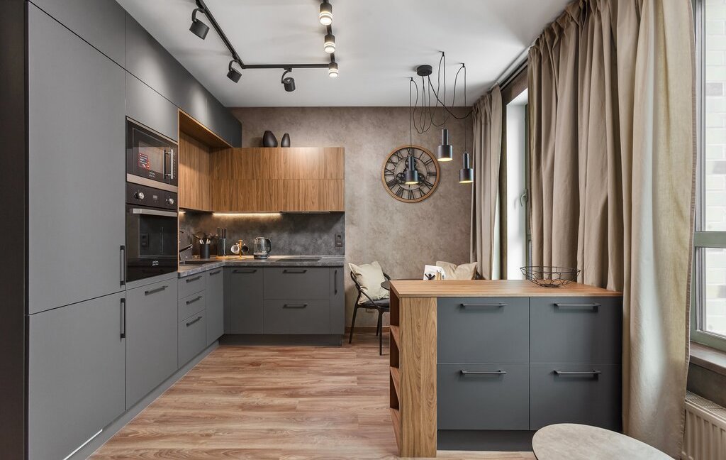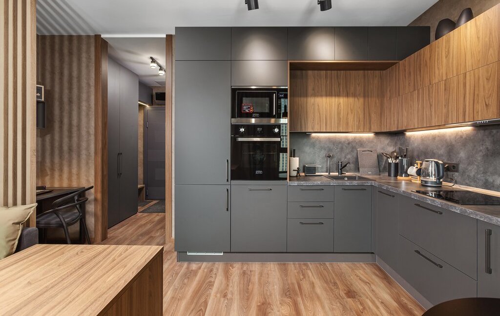 Кухонная зона оснащена направленным освещением и подсветкой в зонах готовки.