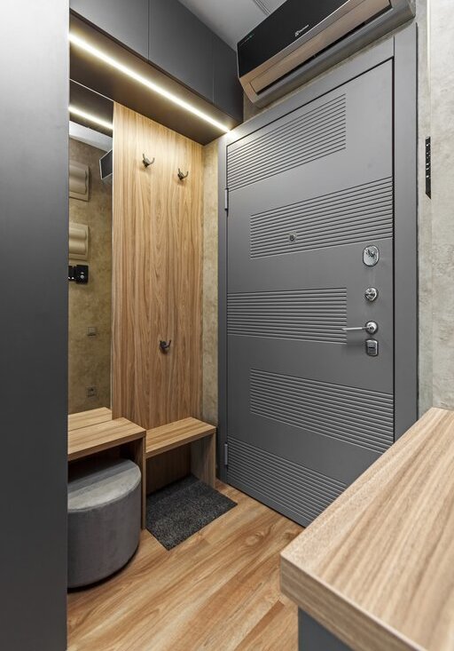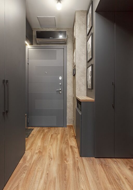 Уютная прихожая с местами хранения одежды и отдельным шкафом для хранения хозяйственных предметов, включая пылесос, гладильную доску HAUSHALT, утюг, эргономичную сушилку для белья Bresio и компактную стремянку-табурет Davding