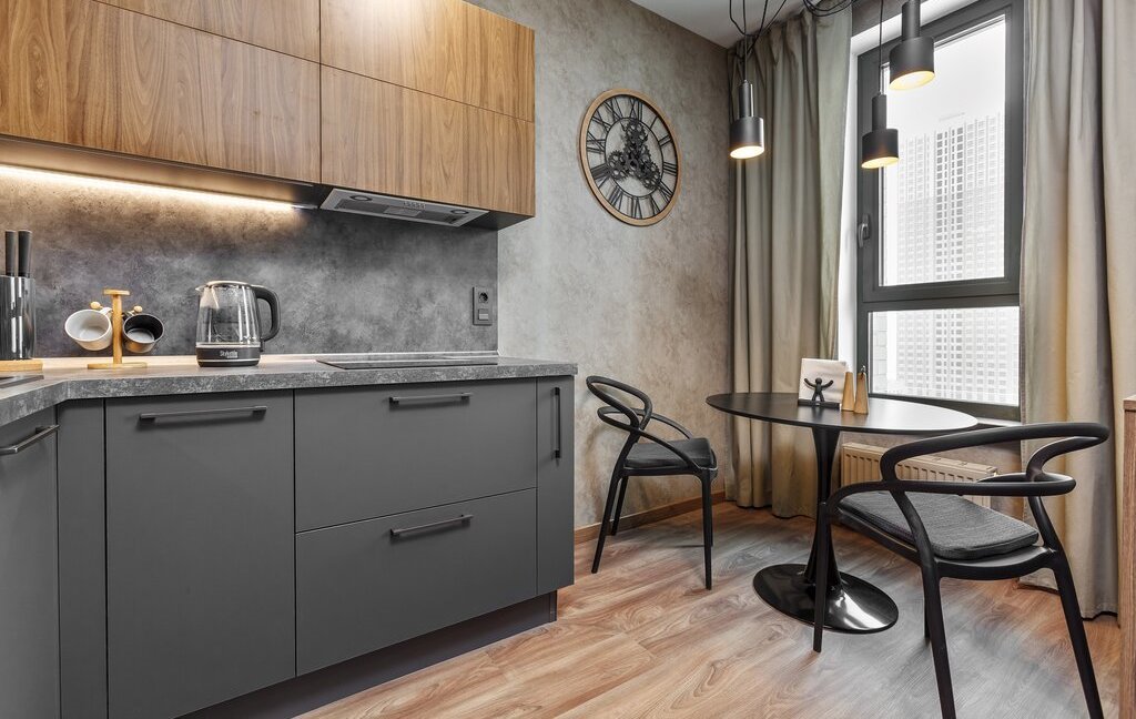 Студия оборудована по принципу «въезжай и живи», в ней есть все для комфортной жизни, включая посуду и необходимые бытовые принадлежности