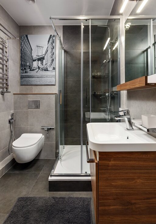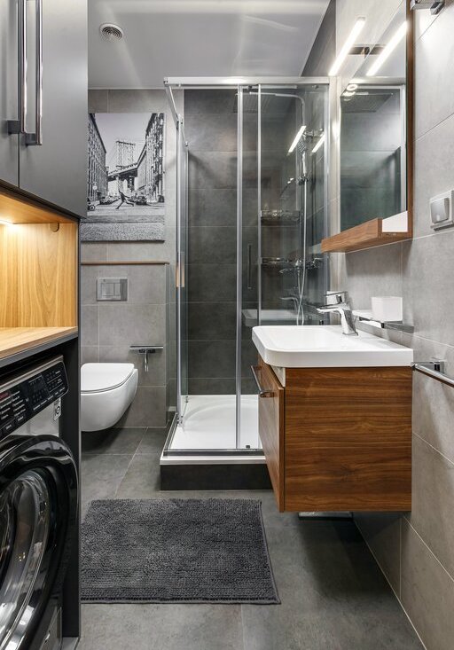 В ванной комнате установлена сантехника TECE, раковина и душевая кабина Ravak с тропическим душем Grohenberg, бесшумная стиральная машина LG