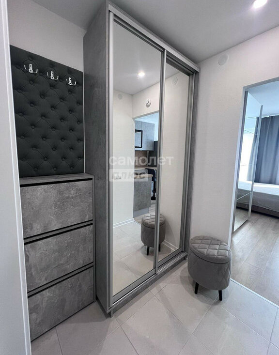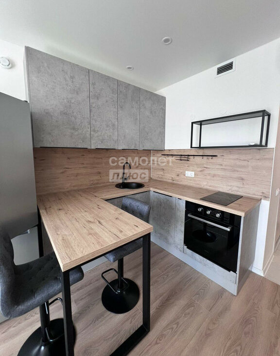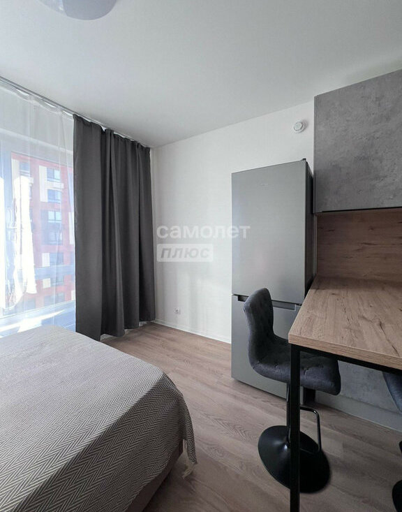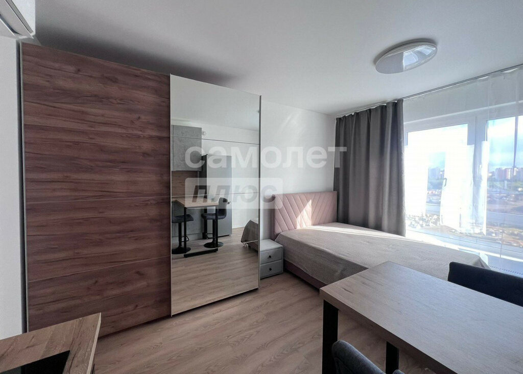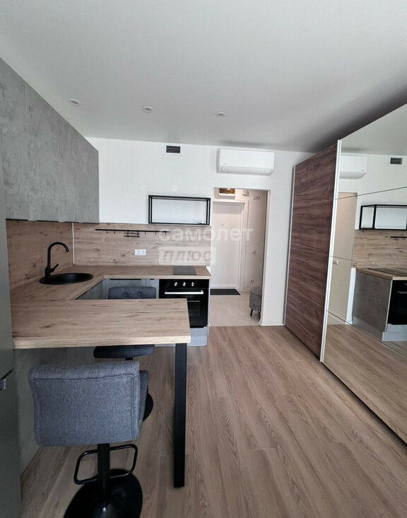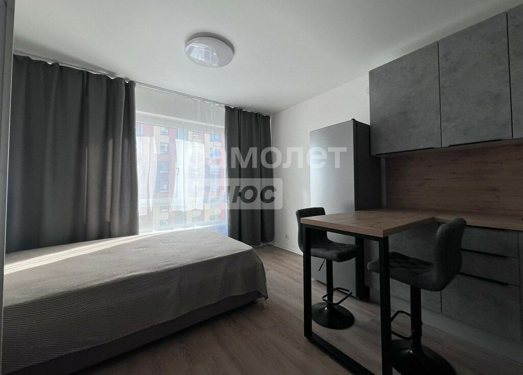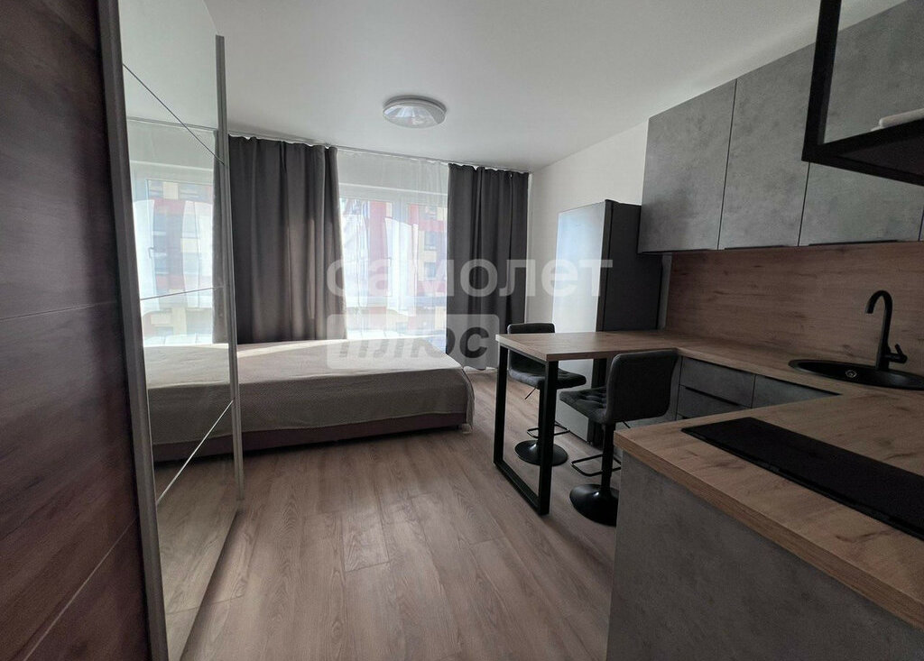 Представляем к сдаче стильную студию, полностью готовую к проживанию. Интерьер выполнен в спокойных серых оттенках, создающих атмосферу уюта и расслабления. Зона сна: удобная кровать с качественным матрасом, достаточно места для комфортного отдыха.Кухонная зона: современный гарнитур, практичная столешница, высокие барные стулья — идеально для завтраков и быстрых перекусов.Освещение: яркий потолочный светильник, который равномерно освещает всю комнату.Окна: большие, с плотными шторами, обеспечивают приватность и регулируют уровень естественного света. Пол: качественное покрытие, лёгкое в уходе.